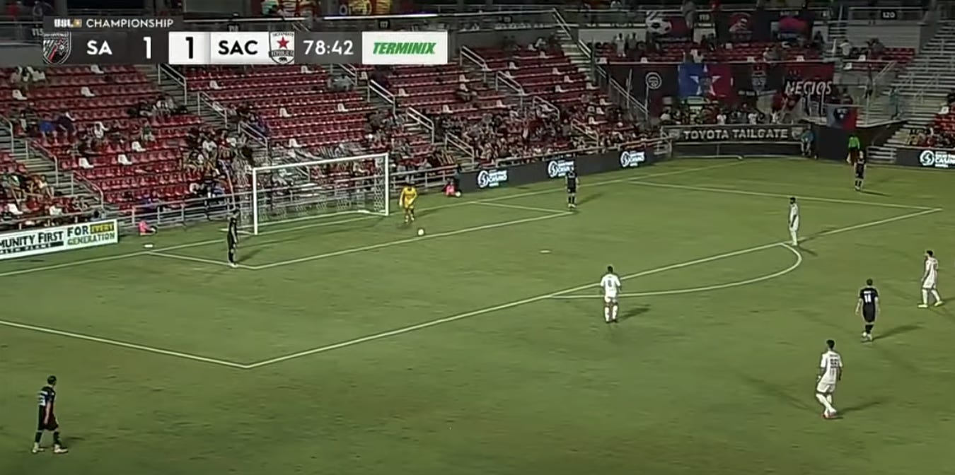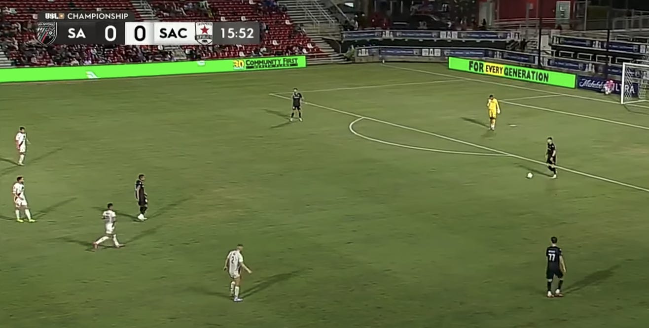 This is on a goal kick, and it allows SAFC to play the ball from the back on the ground. 20 minutes later, San Antonio’s lone goal comes from a lack of press as well (we’ll look at that later). Compare that to how high Republic press in the second half: