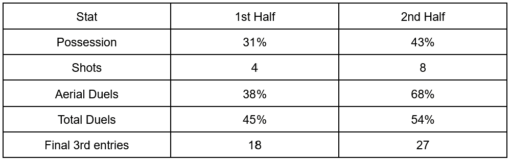 The big story in this match is Collins halftime adjustments. While there were no subs made, Republic went from a fairly nervy ending to the first half, to completely dominating the second half. Let’s compare some numbers: