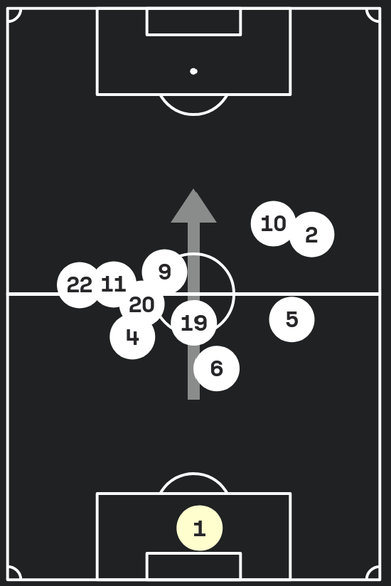 This is also on a goal kick, but this time Republic are pushed way up. SAFC opt to go for a long kick instead of playing it short, and Republic win the aerial duel, which quickly turns into a chance at goal for the Quails.