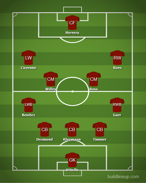 He just has so much space on the ball here after his dummy step to the left, and it’s why the wing-backs are so important when Republic is on the attack. Neither player involved with this play is a forward; Willey is a midfielder and Benítez is playing that defensive role on the wing. But in this system, those wing-backs become major parts of the Republic attack—because the opposing defense struggles to mark them as they rush up field.
