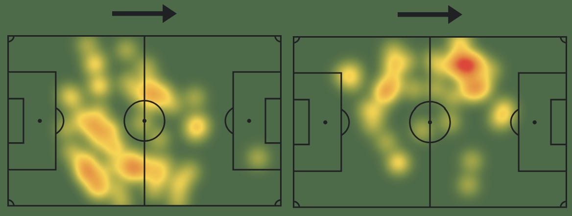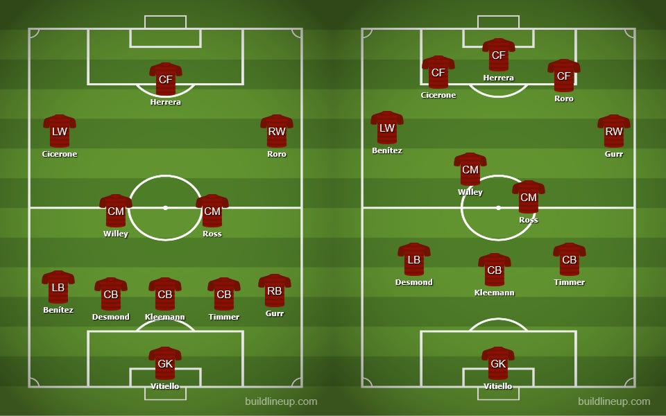 Where the wing-back’s end up on the attack depends on if they are cutting outside or inside, but you get the general idea here. Press high and then counter as soon as they win the ball. You’ll notice that Willey and Ross often stagger a bit on the attack; Ross often plays as more of a central defensive midfielder, which gives Willey the freedom to press up a bit more. Compare their heat maps from this match: