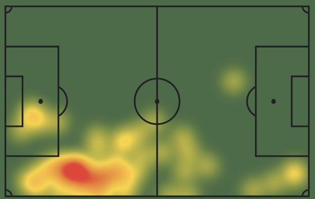 Either way, Gurr being in the 18 at all means it probably isn’t that serious of a knock, and Spaulding started at right back. Spaulding’s positioning was… interesting. Looking at his heat map, he essentially sat pinned in the back right corner of the field the entire game: