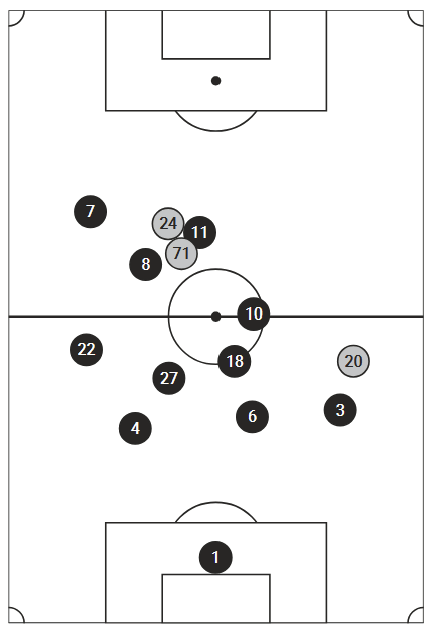 Now, this could purely be a result of Spaulding being a late addition to the starting line up, and Collins opting for more defensive stability over a right side attack with such a late adjustment. On the other hand, this could be the start of a trend, where Republic specifically attacks one side of the field. Look at Republic’s average positioning, by player number: