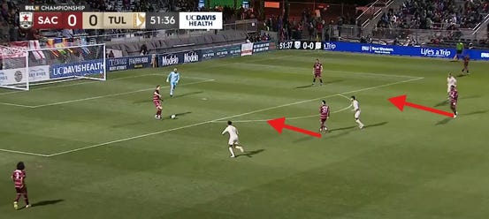Here, Vitiello plays the goal kick short, both outside backs split wide, and both Kaye and Crisostomo drop back to receive the ball. This is, essentially, the entire role of a double pivot - they play as outward defensive “sweepers” when not in possession, and as transitional pieces to get the ball from the backline to the offense while in possession. Keep an eye on this all season - Collins' tactic heavily relies around these 2 players controlling the game on both sides of the ball. Now let’s focus in on the attacking side: