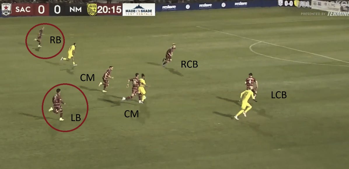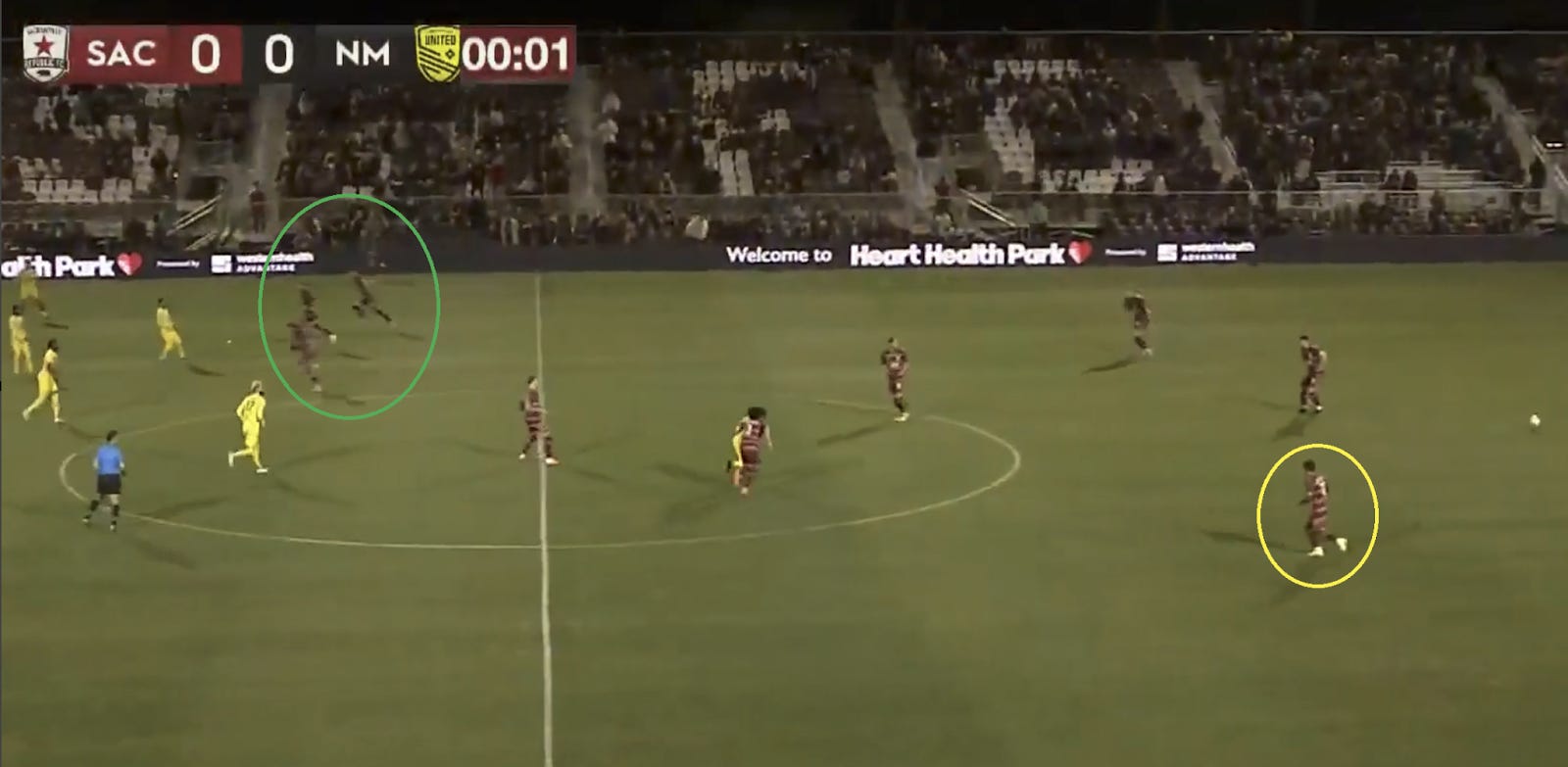 New Mexico’s attacking front is fast and they came in with a game plan to utilize that. Republic were caught out on this goal far too easily and it exposed the issue with having that fluid back three: if you do it wrong, you end up trying to fight off a counter with only two at the back. You can see that both Gurr and Benítez (circled) are caught up field when the Republic lose possession, and cannot get back into formation.