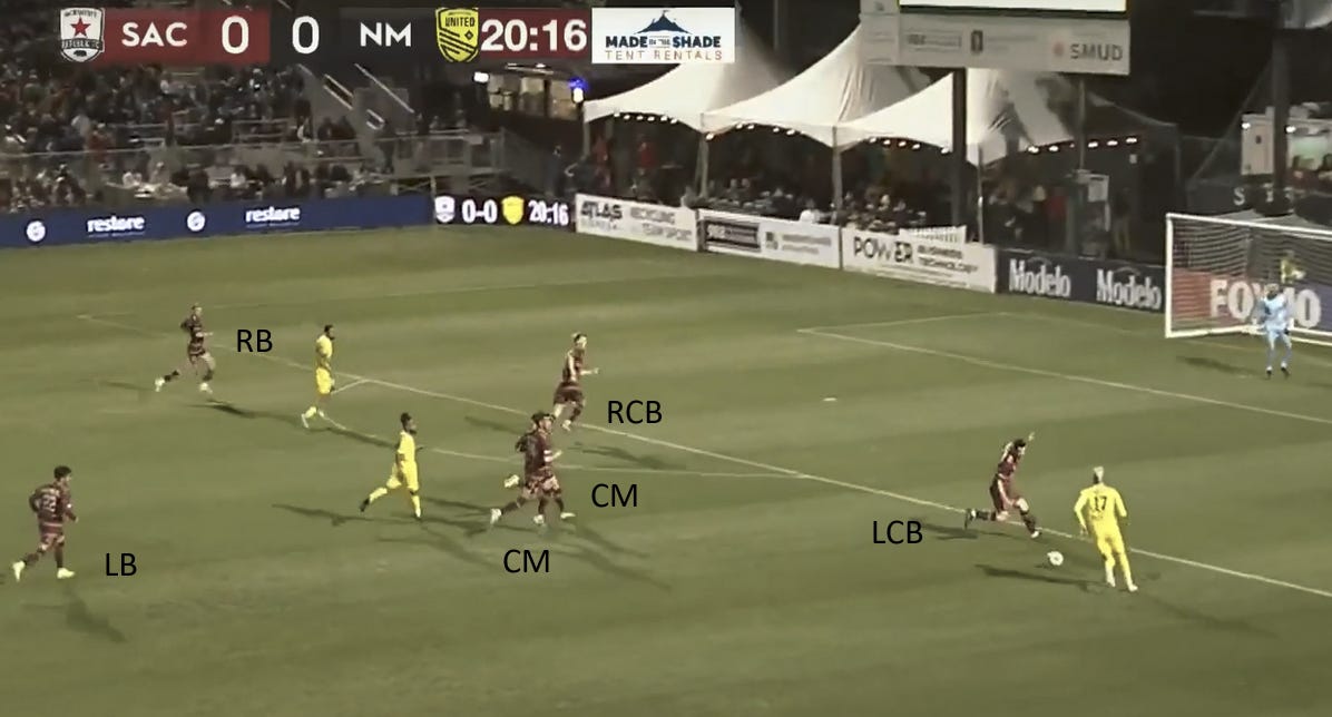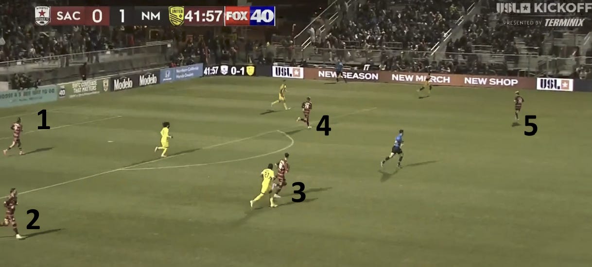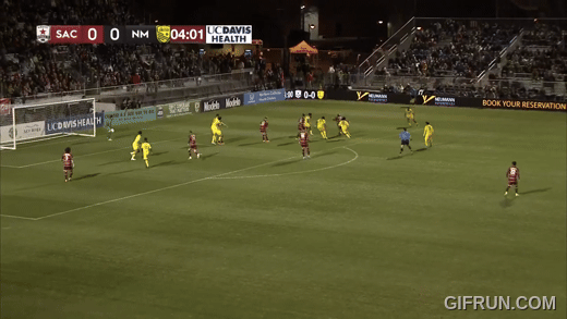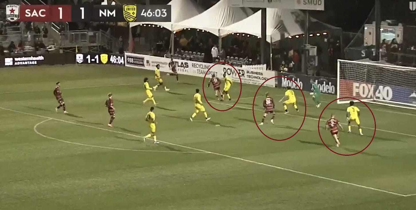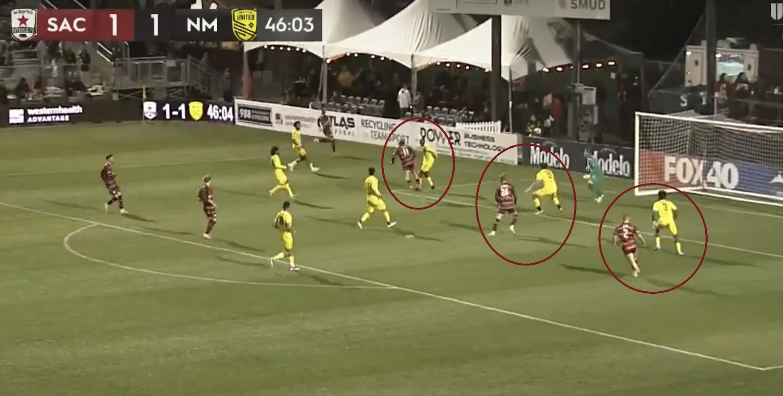 Then we have Sacramento’s goal from open play, which also came from counter-pressing after losing possession. Willey really starts this play off by winning the possession in the midfield and then laying off a great pass out wide and when Sacramento crash the goal, New Mexico just get beat on nearly every man: