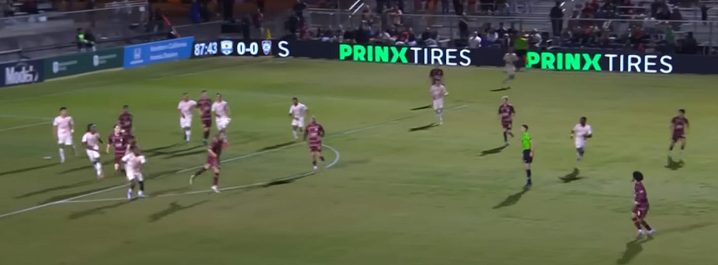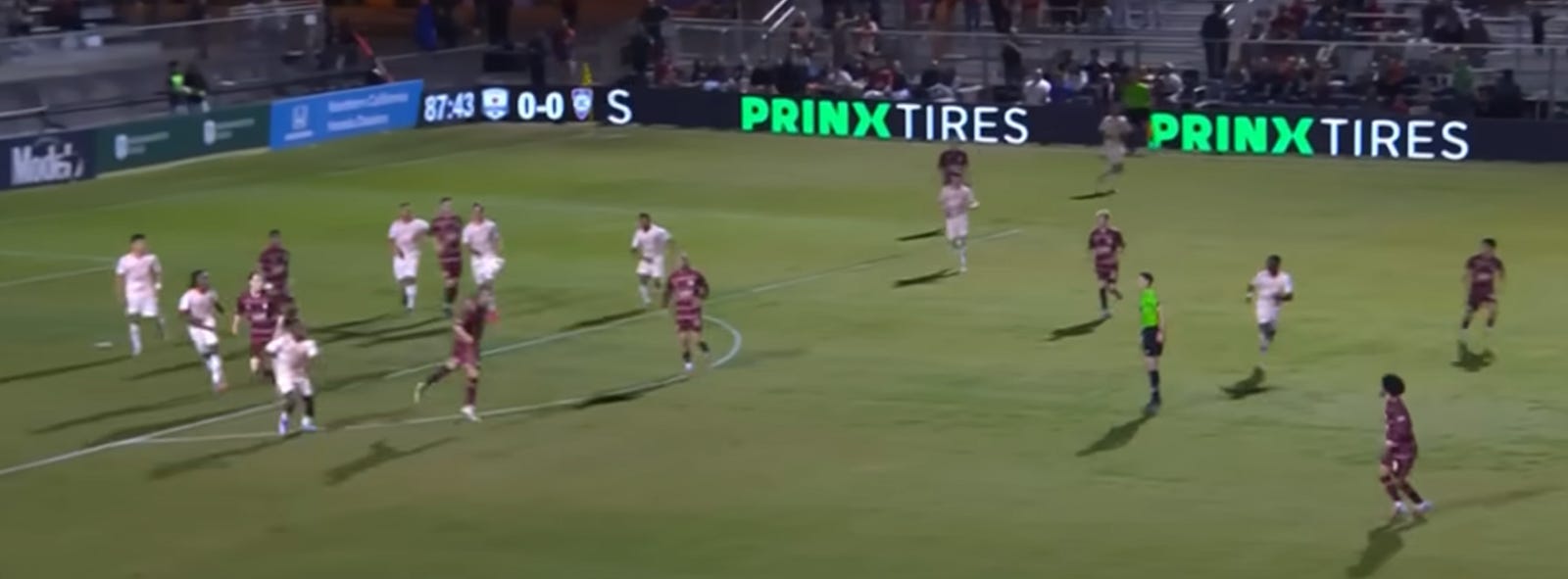 Funny enough, one of Republic’s best chances of the night is immediately following the image of OC’s backline above—and it’s because Spaulding takes the ball outside, drives at goal, and then passes to into the box, one of the few times a Sacramento player is able to do so: