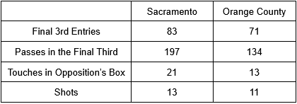 Republic led by a decent amount in each category, but only managed two extra shots. Orange County actually had more shots inside the box despite having eight fewer touches. Republic have been good all season at getting the ball into an attacking position, but they continue to have almost no ability to actually turn those positions into chances on goal.
