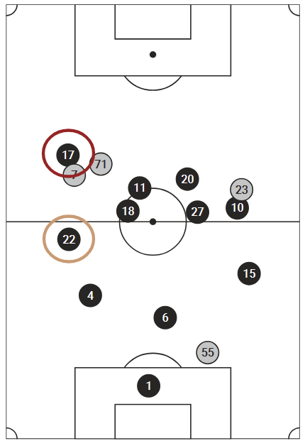 Speaking of that unlocked offense, the player that is most unlocked by Benítez pushing forward is Dominik Wanner. Look how far his average positioning is compared to every other Republic player—he’s number #17: