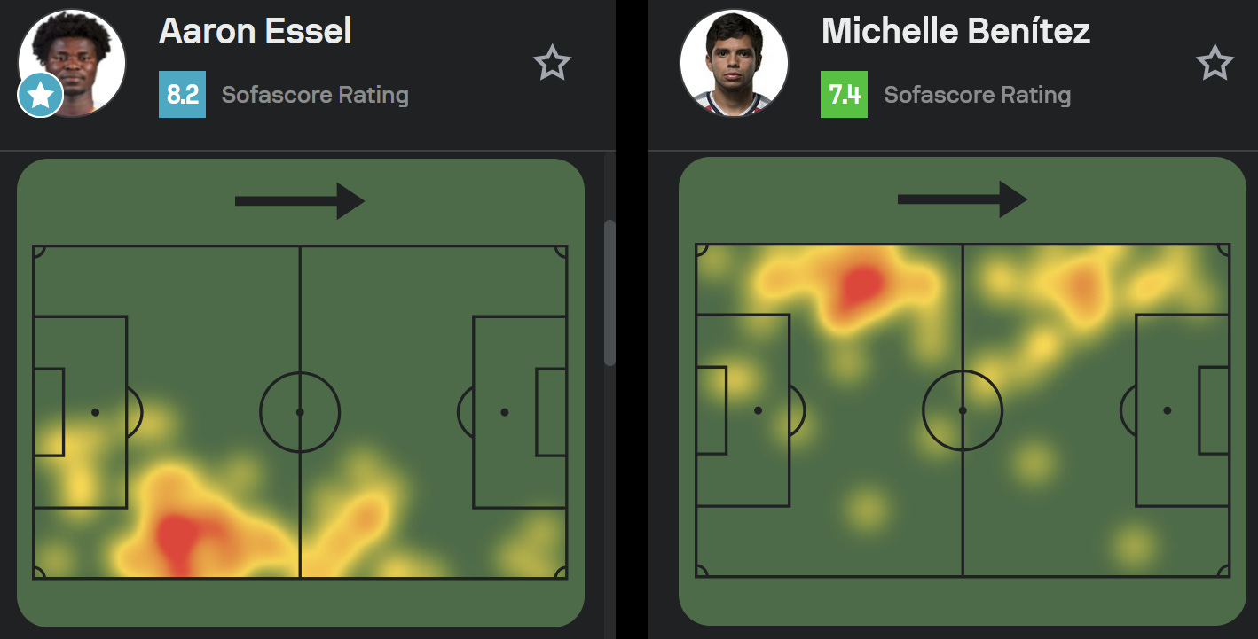 Essel does get forward occasionally, but not as often or as far as Benítez, and Essel drops towards the middle right of the pitch more often than Benítez drops to the middle left. This largely shifts in the second half, where Republic start to give up more ground with a 2 goal lead, but the flexibility of the defense to allow Benítez to push forward really unlocks the offense.