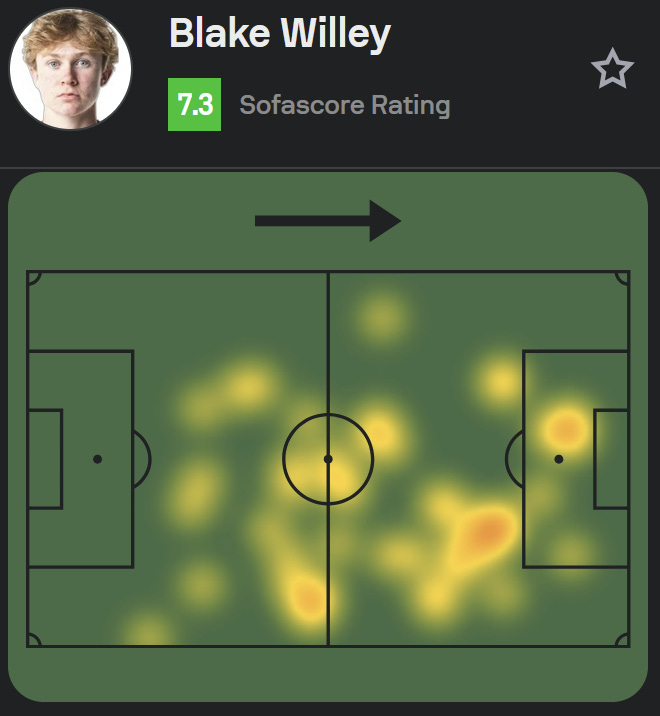 Blake Willey also showed up in a big way, and I couldn’t be happier for him. He became the 5th Republic academy prospect to score for the first team when he scored his first professional goal in just the 10th minute of the match. Doing it during a home match in his hometown makes it even sweeter. Blake really deserved a goal last season with how well he played, and he is really developing into a true box-to-box midfielder. Look at his heat map, he’s all over the place: