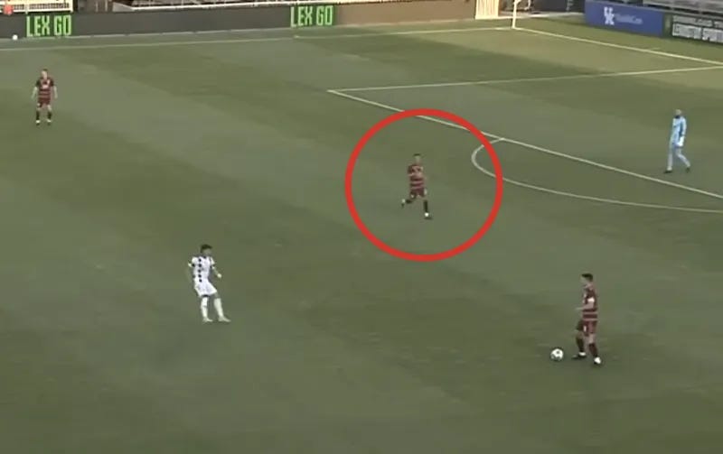 Both drop in and back fairly often throughout the game, almost to the sideline, because they are covering for both wing backs going up pitch. We’ll have to see if this adjusts to just Crisostomo dropping when he and MAK return from injury, but this is a great sign that Republic is getting their offensive verticality back without losing their defensive structure.