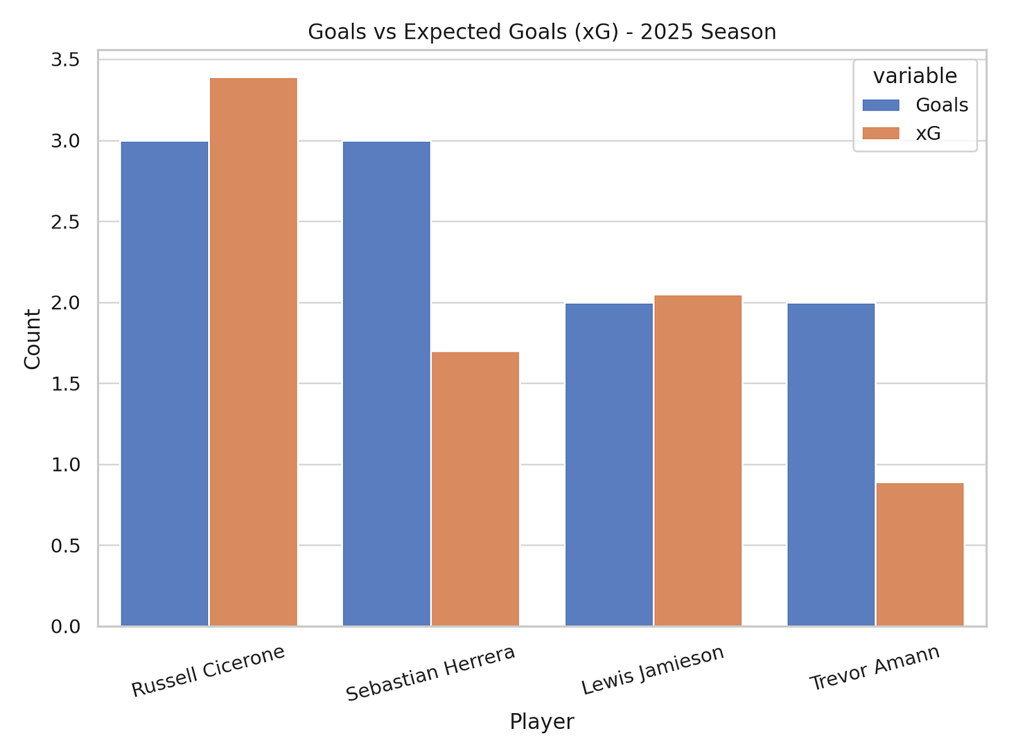 Russell Cicerone and Sebastian Herrera currently lead the team with three goals apiece. On paper, that looks balanced. In practice, it reveals a much deeper problem.